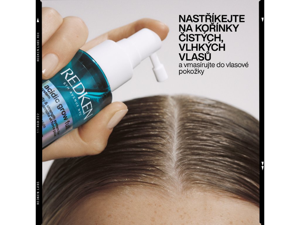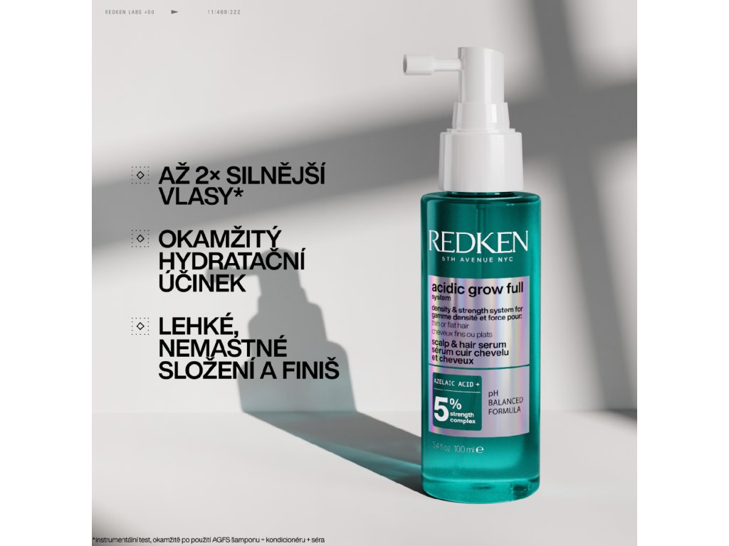 Komplexní sérum na vlasy a vlasovou pokožku Redken Acidic Grow bylo speciálně vyvinuto tak, aby okamžitě vyrovnalo vlhkost vlasové pokožky a zároveň přidalo vlasům na objemu již od kořínků. Díky kyselině azelaové a 5 % posilujícího komplexu s kofeinem a prebiotiky pomáhá udržovat vlasovou pokožku zdravou a vlasy posiluje, takže jsou silnější a viditelně plnější.