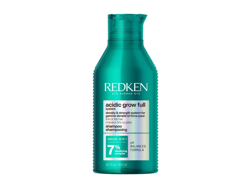 Komplexní šampon pro zahuštění vlasů Redken Acidic Grow šetrně čistí vlasovou pokožku a navrací jí ztracenou rovnováhu a hydrataci bez toho, aniž by narušil její ochrannou bariéru. Jeho lehké složení ve formě gelu se na vlasech promění v jemnou pěnu, která jim dodá objem a hebkost od kořínků až po konečky. Obsahuje kyselinu azelaovou a 7 % komplexu pro zahuštění vlasů, které společně vytvářejí optimální prostředí zdravé vlasové pokožky a vlasům dodávají hustotu a objem.