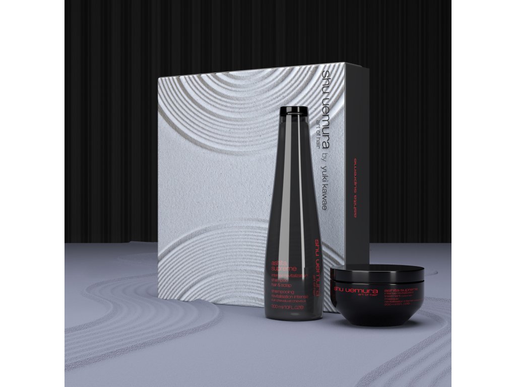 Luxusní dárková sada Ashita Supreme je pro intenzivní péči o vlasy a pokožku hlavy. Složení výrobků je bohaté na výtažky z ashitaby, prastaré japonské rostliny proslulé svou schopností rychle regenerovat.