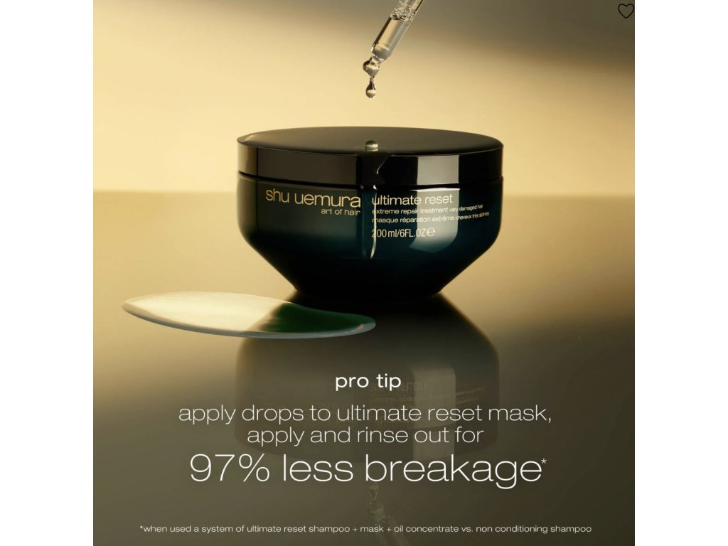 • výživa během mytí: stačí přidat dvě drahocenné kapky do masky ultimate reset pro mimořádné posílení – vaše vlasy budou 4,2x poddajnější*, 1,3x snáze rozčesatelné* a okamžitě hloubkově vyživené